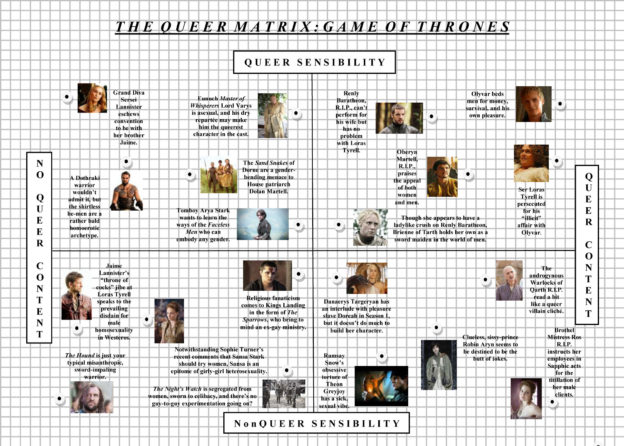 I am a huge fan of Game of Thrones and doing a queer matrix on the show had been bouncing around my head for a while. Before we get to that, here are some disclaimers to reduce the potential flaming I will receive. Both the topic of Game of Thrones and the topic of queer sensibility have a tendency to evoke passionate opinions.