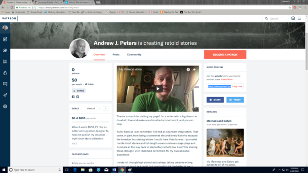 Patreon is actually a really fun platform for both creators and supporters. It’s super easy to use, has a very reasonable entry point (just $1 makes a difference), and I came up with some interesting ways to share my work with readers including interactive storytelling. My main goals are to raise money for editing, book design, and marketing for the short story collection I’ve been talking about here at my blog; plus I want to get my follow up to The City of Seven Gods out into the world.